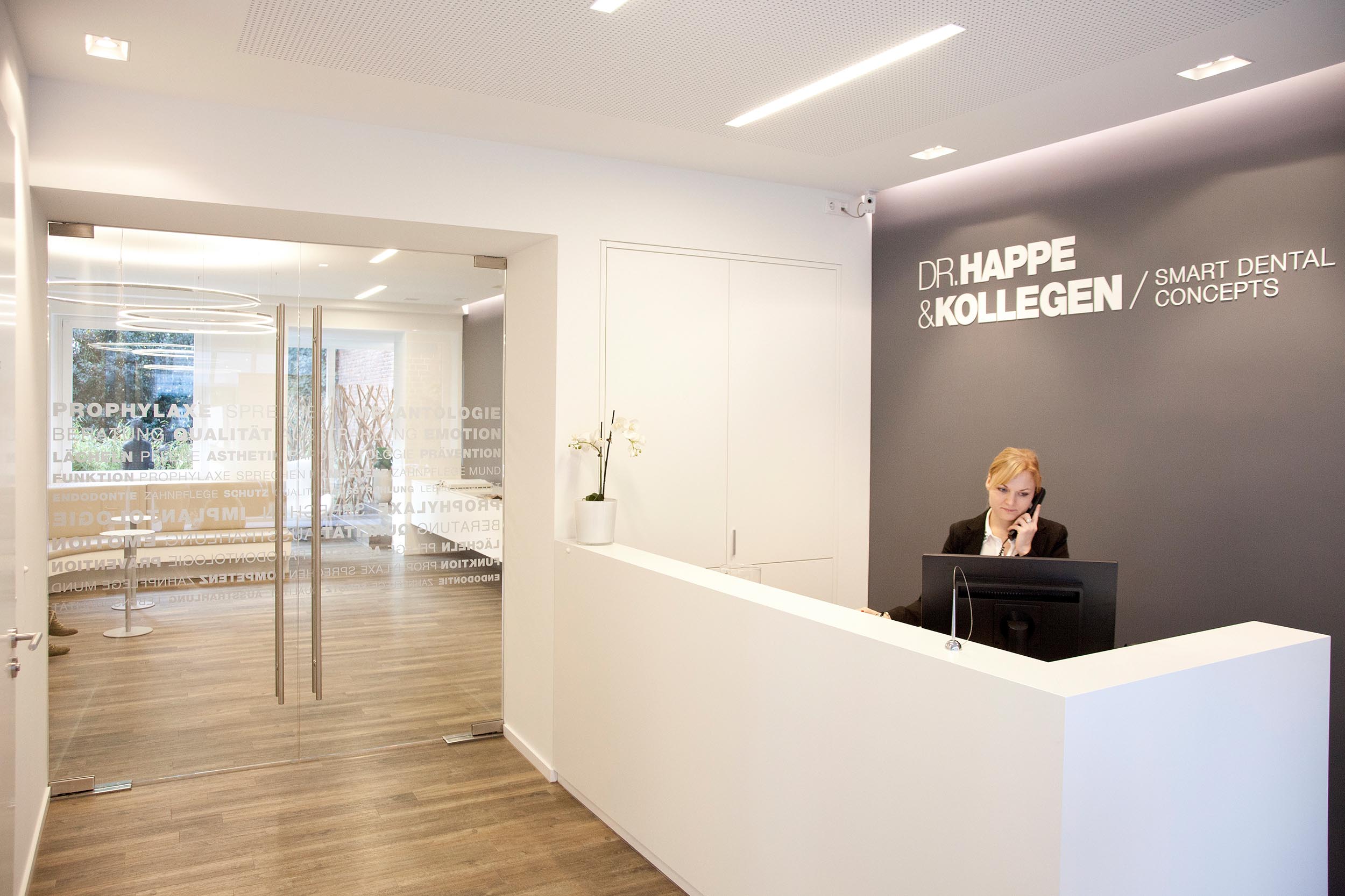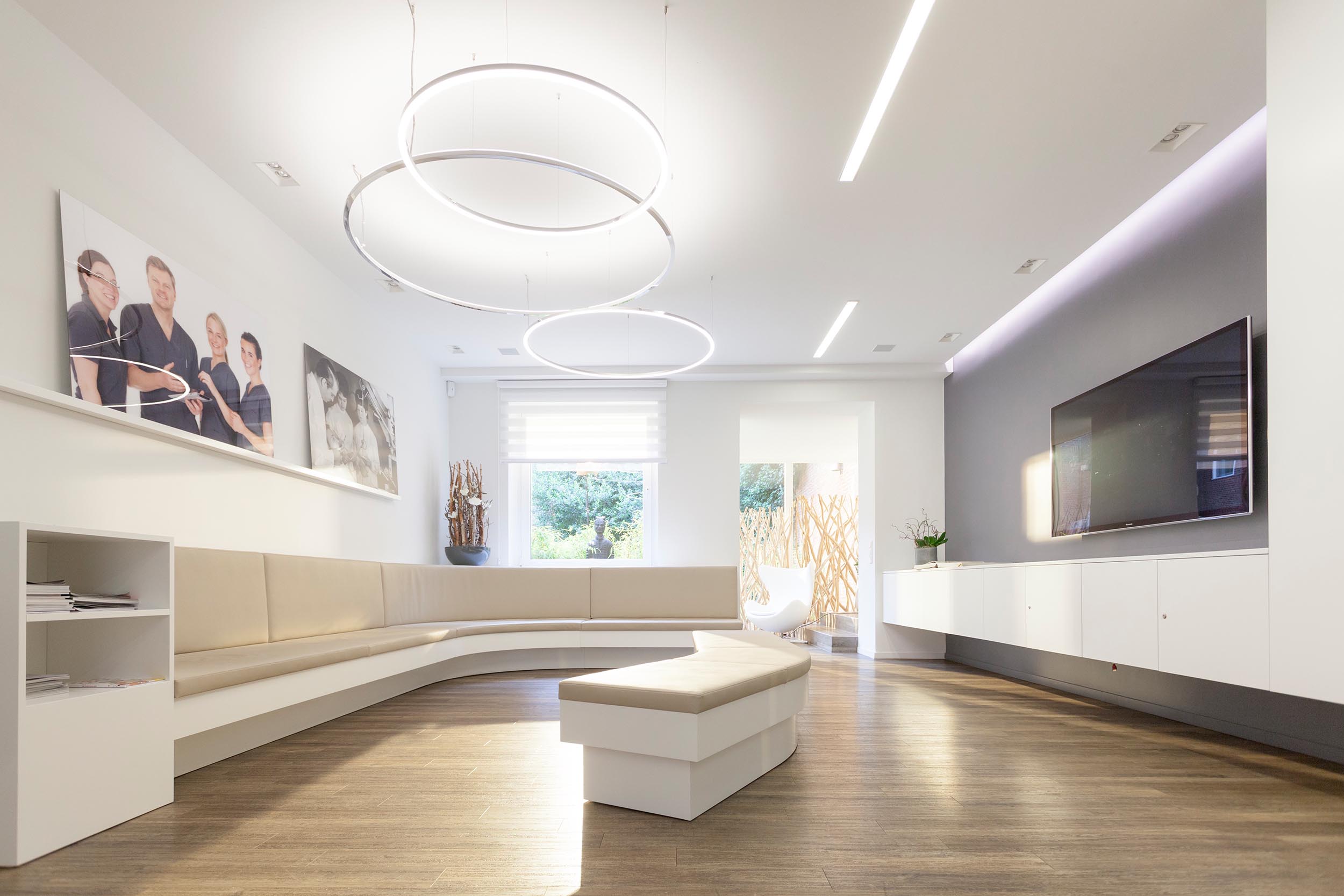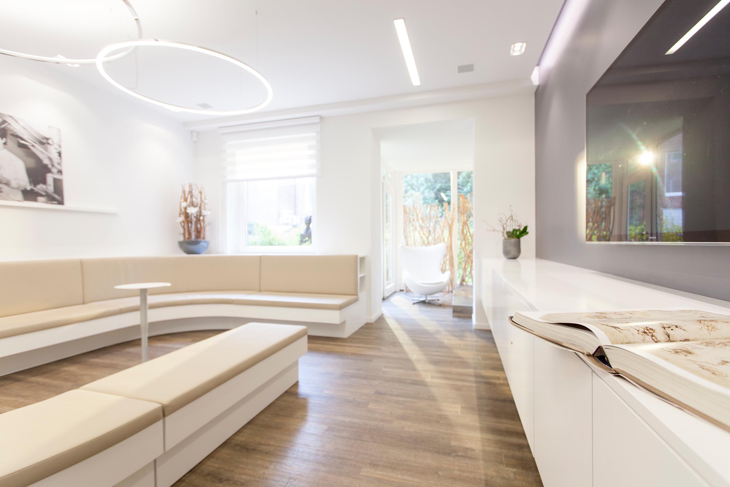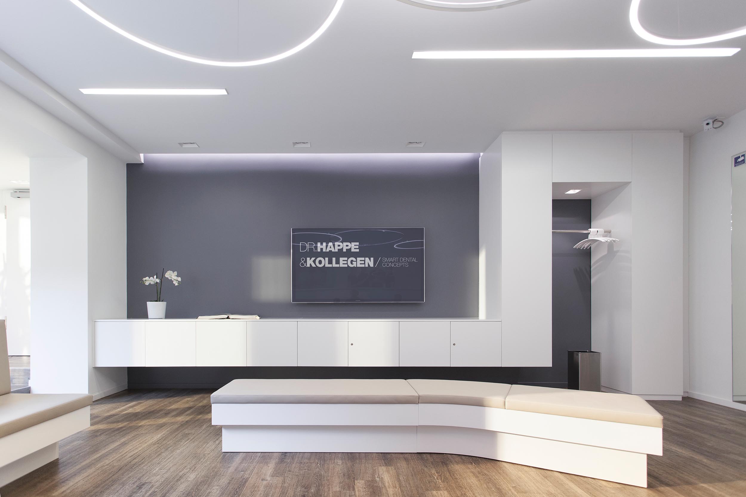 Entwurfsentwicklung und -planung der repräsentativen Eingangs-, Warte- und Beratungsräume für eine Zahnarztpraxis. Die Herausforderung lag neben einer optischen Führung inkl. Lichtkonzept durch einen schmalen Raum mit „Schaufenster”, hin zu einem offenen Wartebereich, der auch für Vorträge genutzt werden kann.