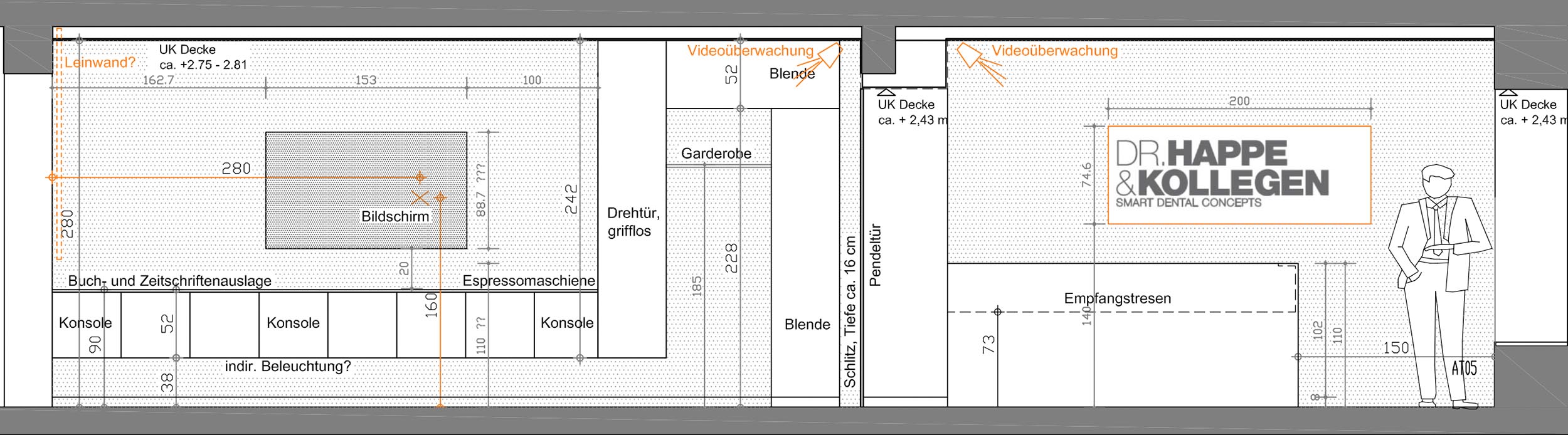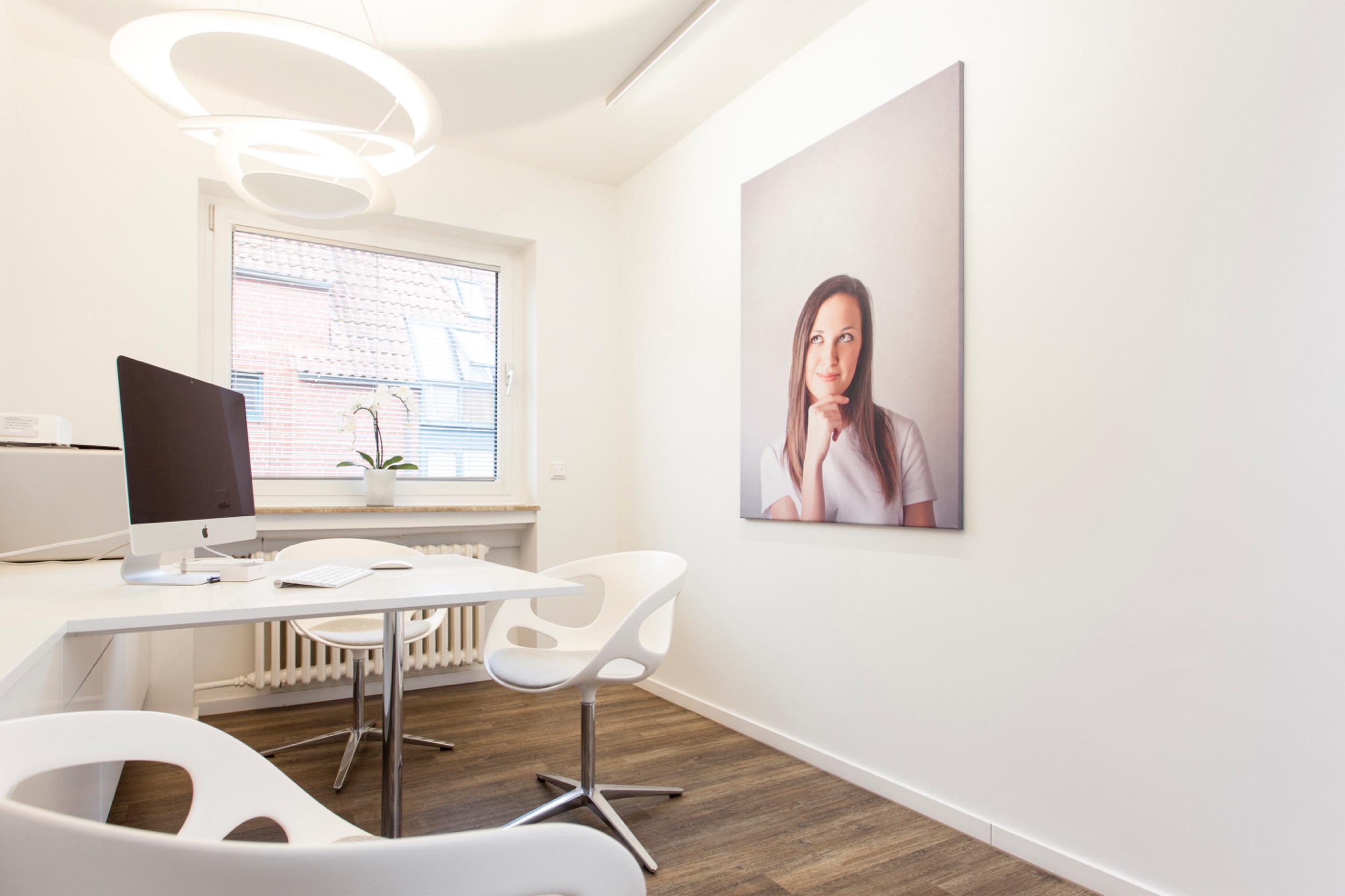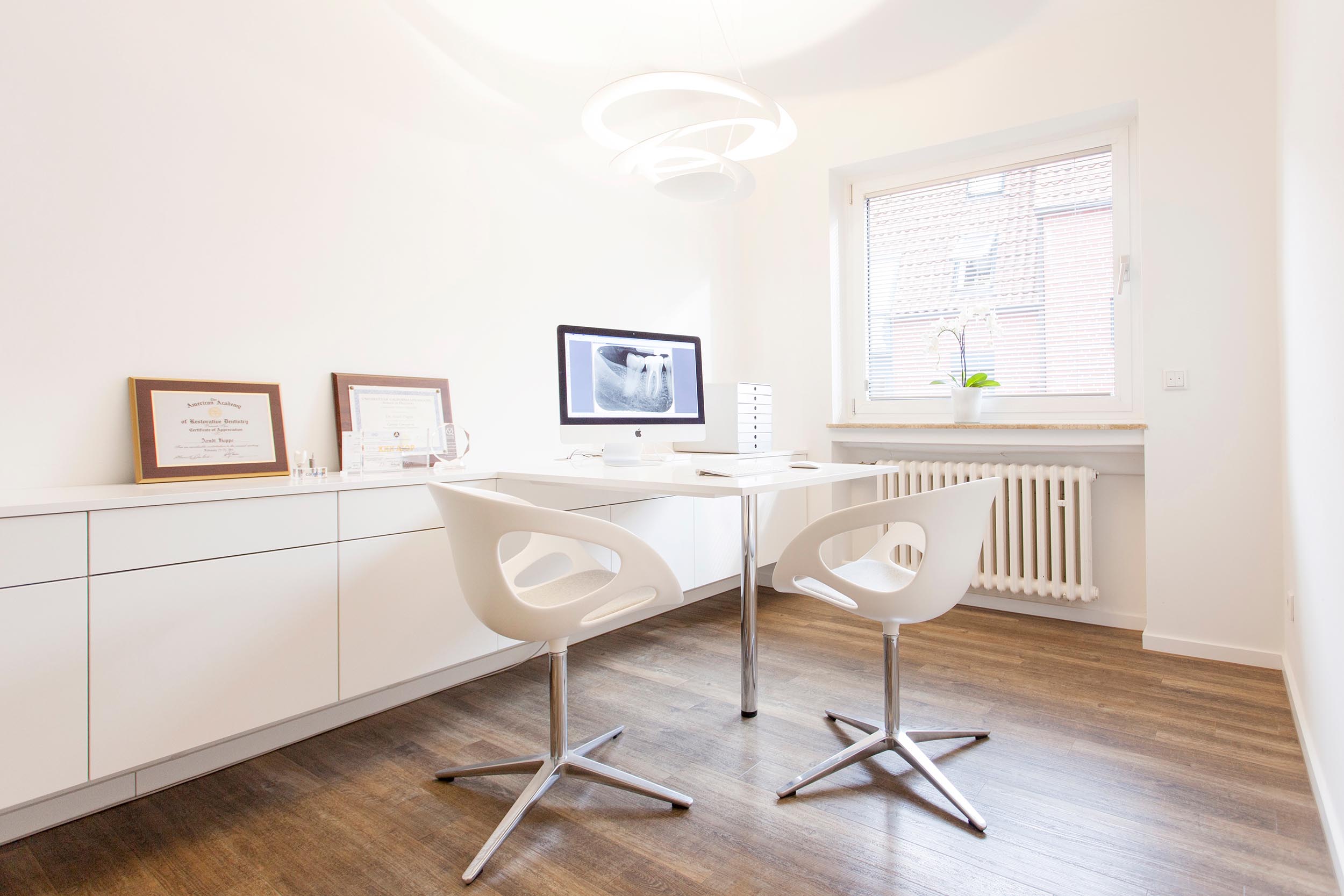 Entwurfsentwicklung und -planung der repräsentativen Eingangs-, Warte- und Beratungsräume für eine Zahnarztpraxis. Die Herausforderung lag neben einer optischen Führung inkl. Lichtkonzept durch einen schmalen Raum mit „Schaufenster”, hin zu einem offenen Wartebereich, der auch für Vorträge genutzt werden kann.