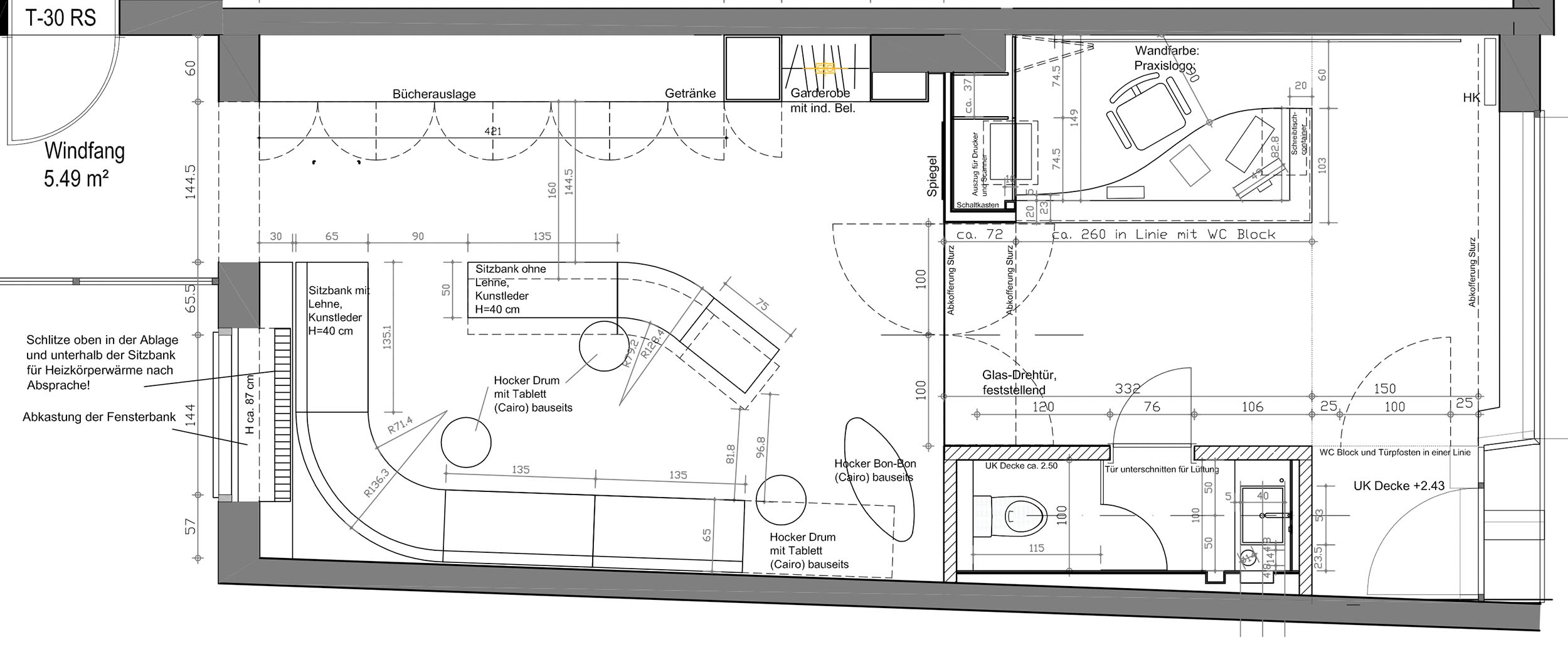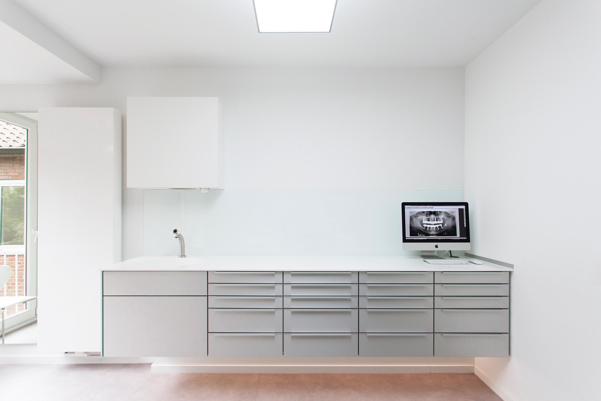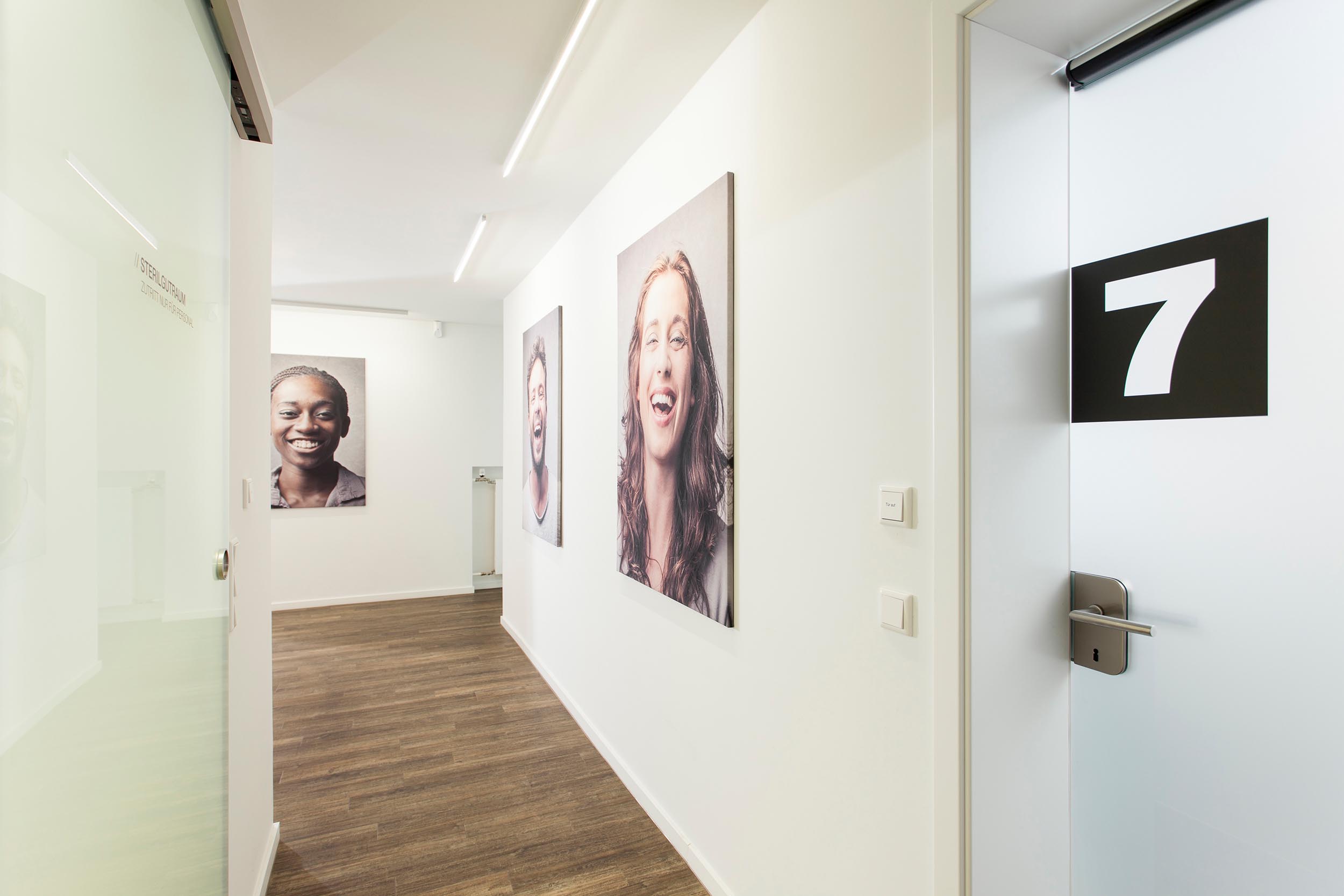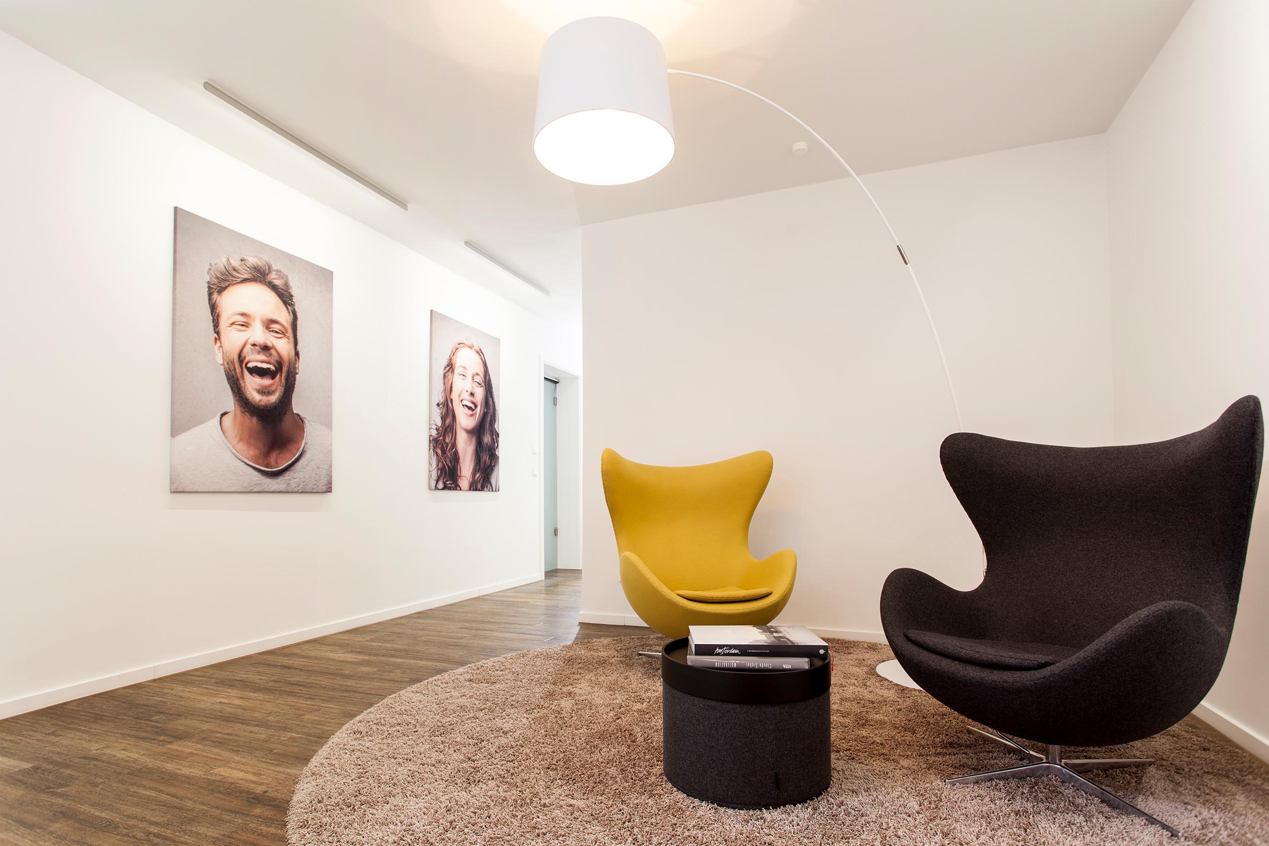 Entwurfsentwicklung und -planung der repräsentativen Eingangs-, Warte- und Beratungsräume für eine Zahnarztpraxis. Die Herausforderung lag neben einer optischen Führung inkl. Lichtkonzept durch einen schmalen Raum mit „Schaufenster”, hin zu einem offenen Wartebereich, der auch für Vorträge genutzt werden kann.