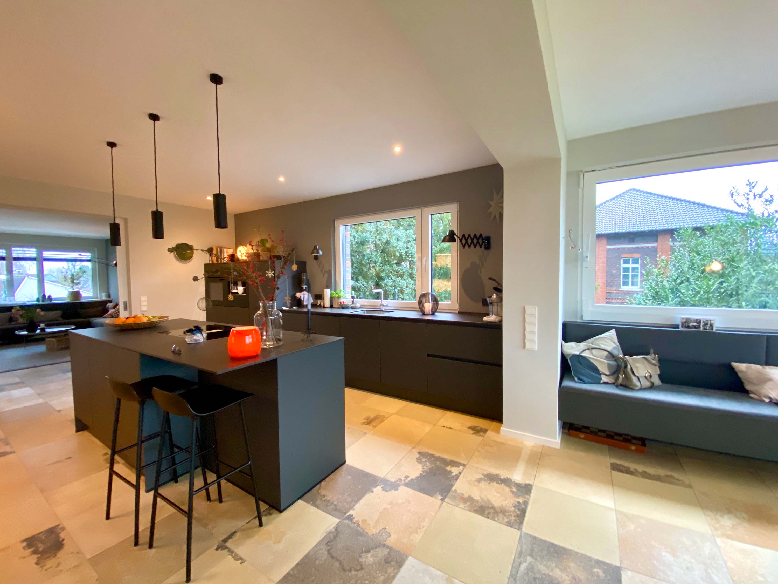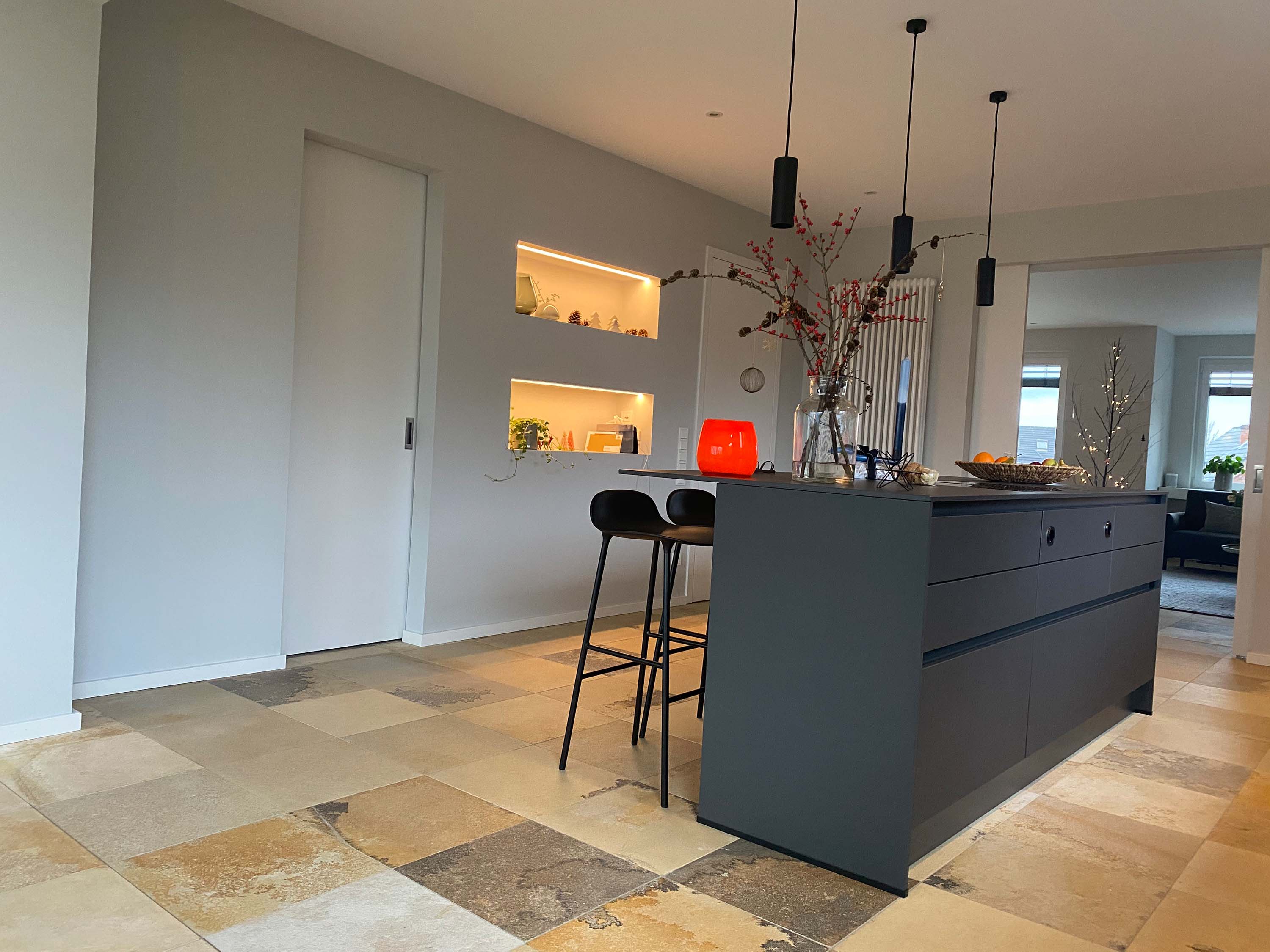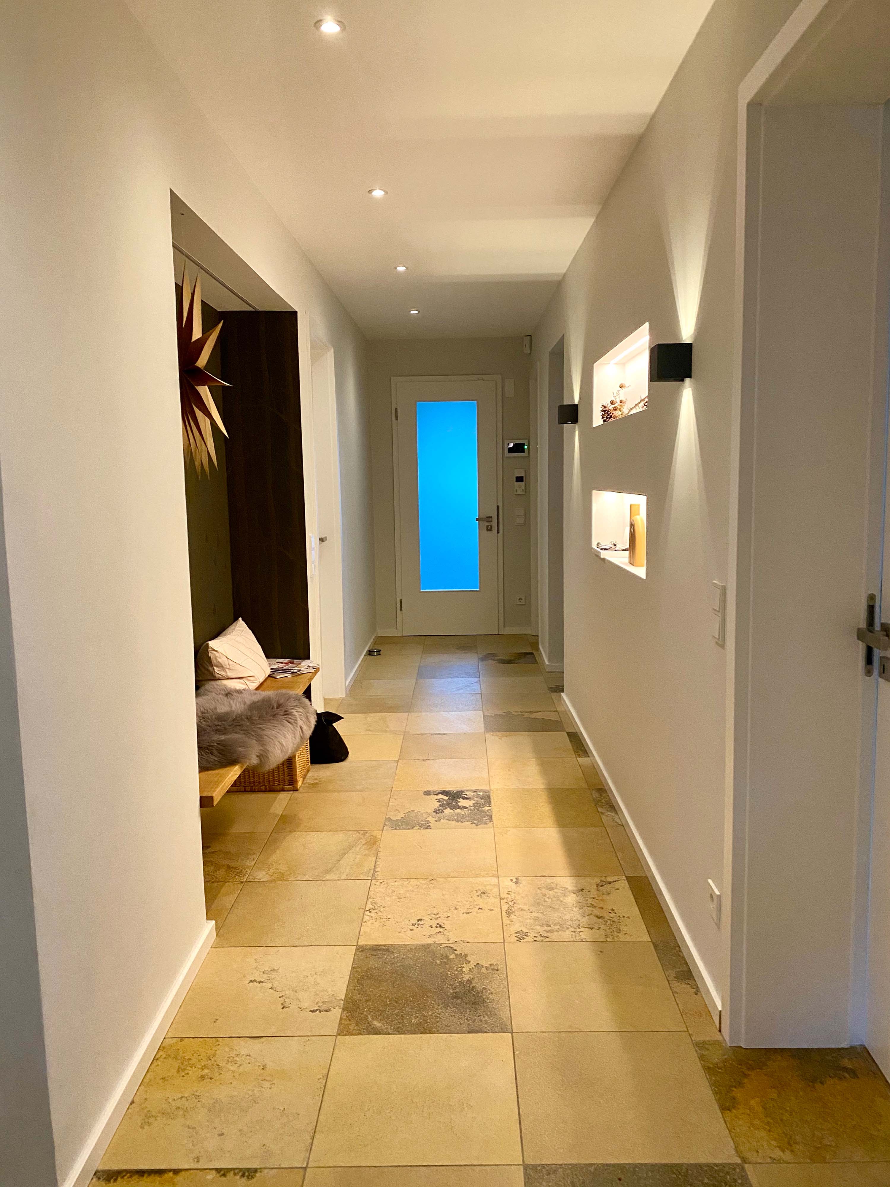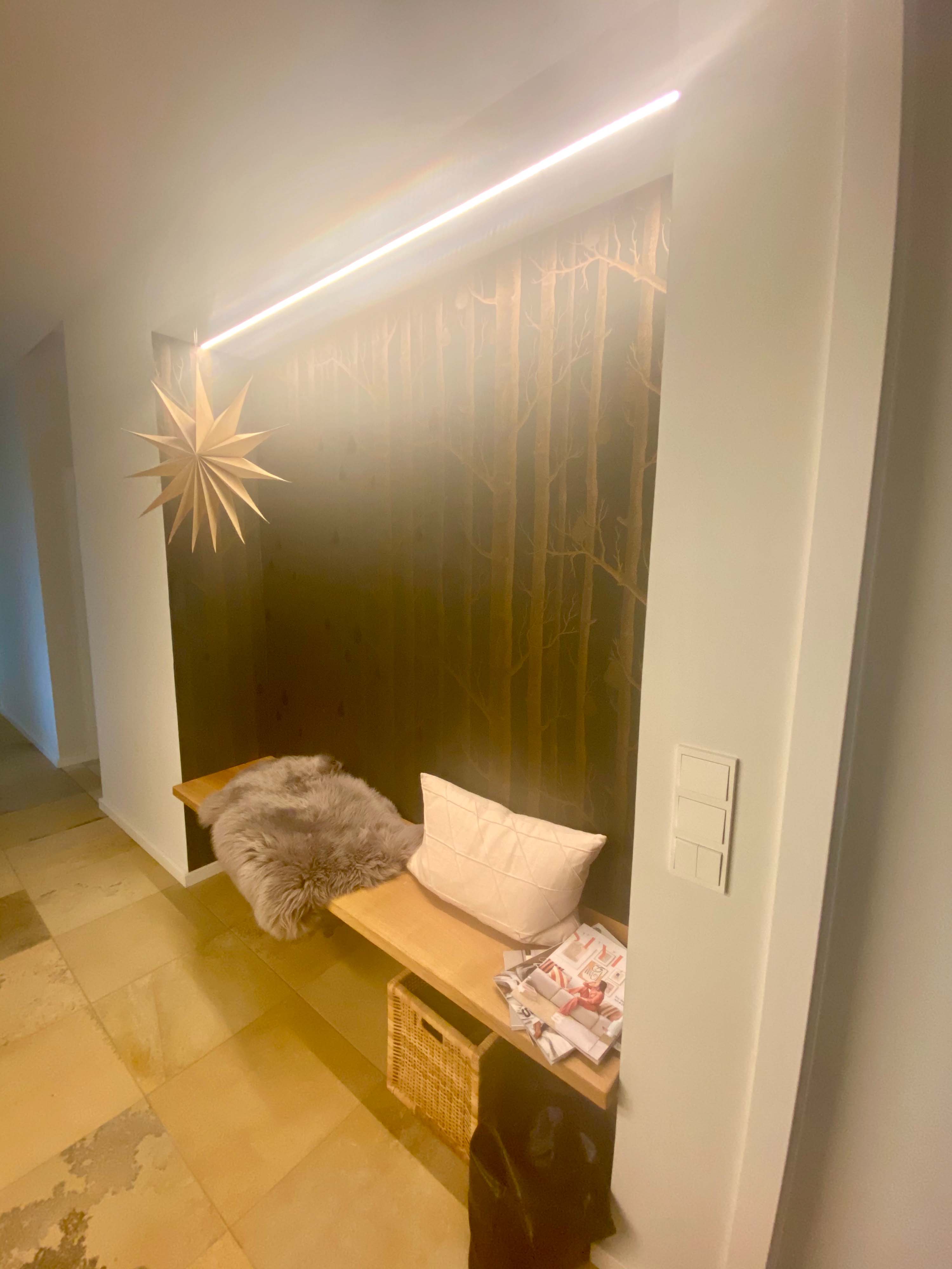 Für die Sanierung einer Wohnung mit sehr großen und somit anspruchsvollen Räumen wurde ein Gesamtkonzept entwickelt, um auf der einen Seite gestalterische Klarheit und gleichzeitig Wohnlichkeit und Behaglichkeit zu erzielen. Eine graue Wand, die sich durch drei Räume zieht und in einer anthrazit lackierten Bank endet, verbindet die Räume optisch miteinander. Das Lichtkonzept mit direkter und indirekter Beleuchtung unterstützt durch „Licht und Schatten” die Atmosphäre. Schließlich bringen Tapeten in ausgesuchten Teilen der Wohnung weitere „Spannung” in die Räumlichkeiten.