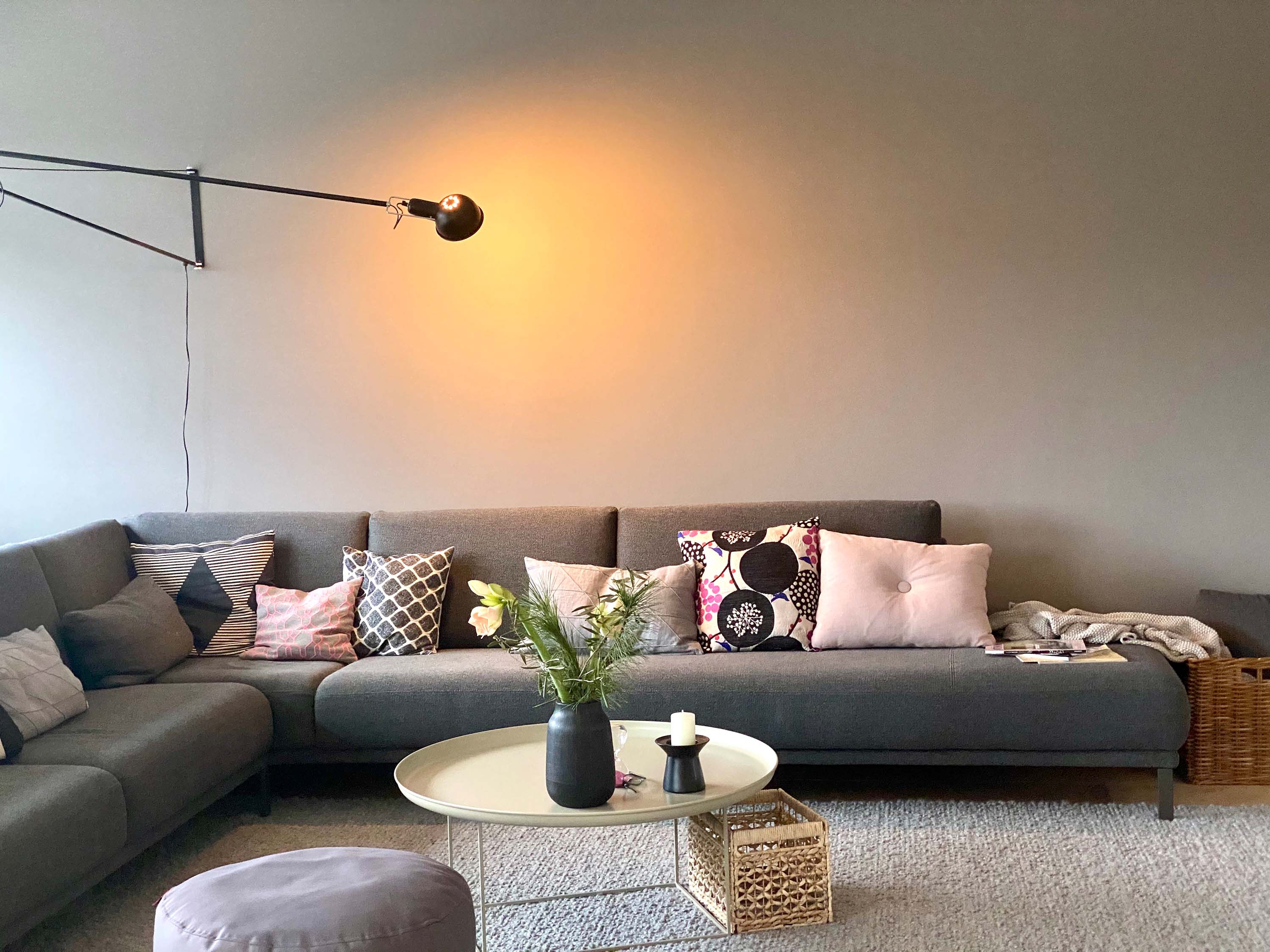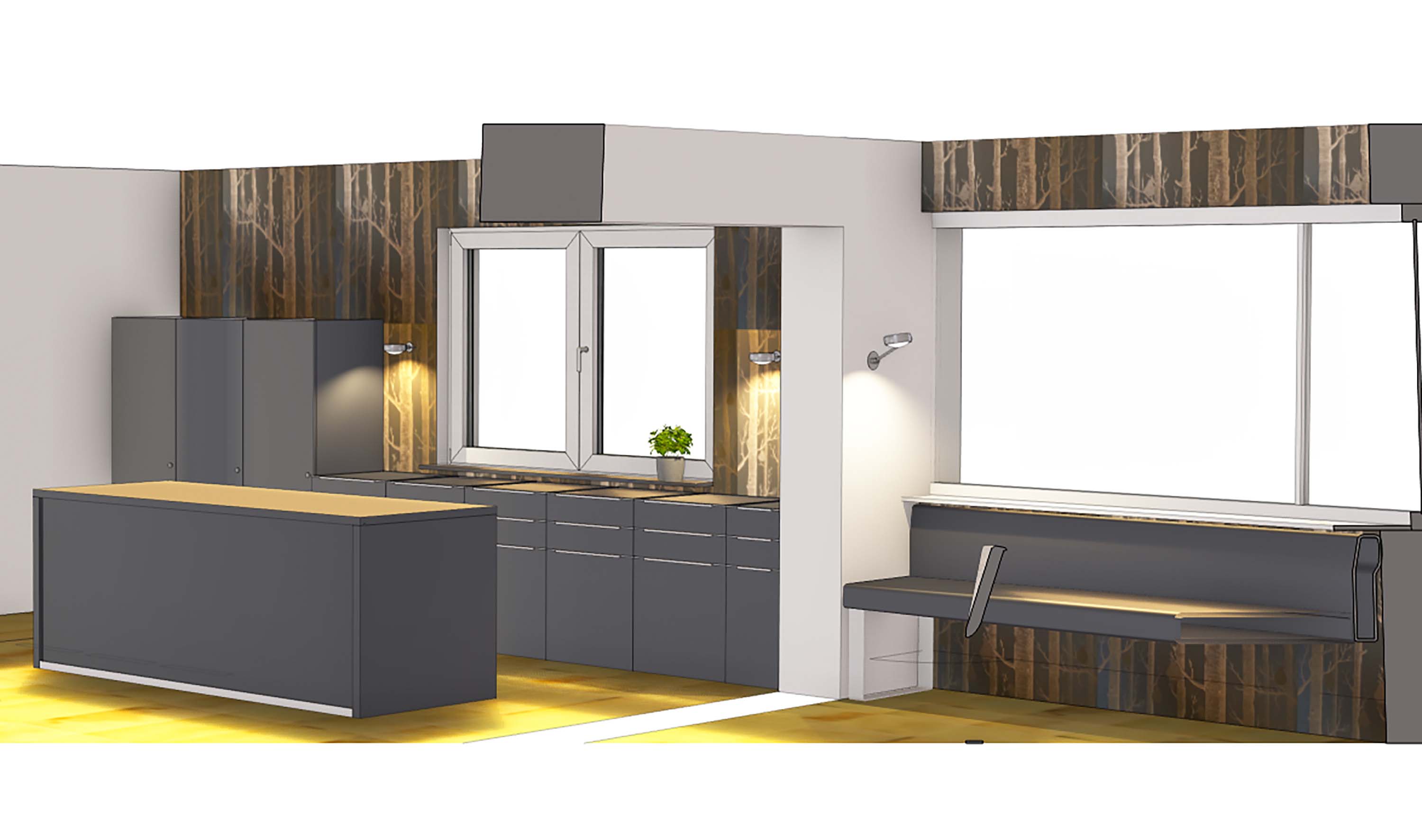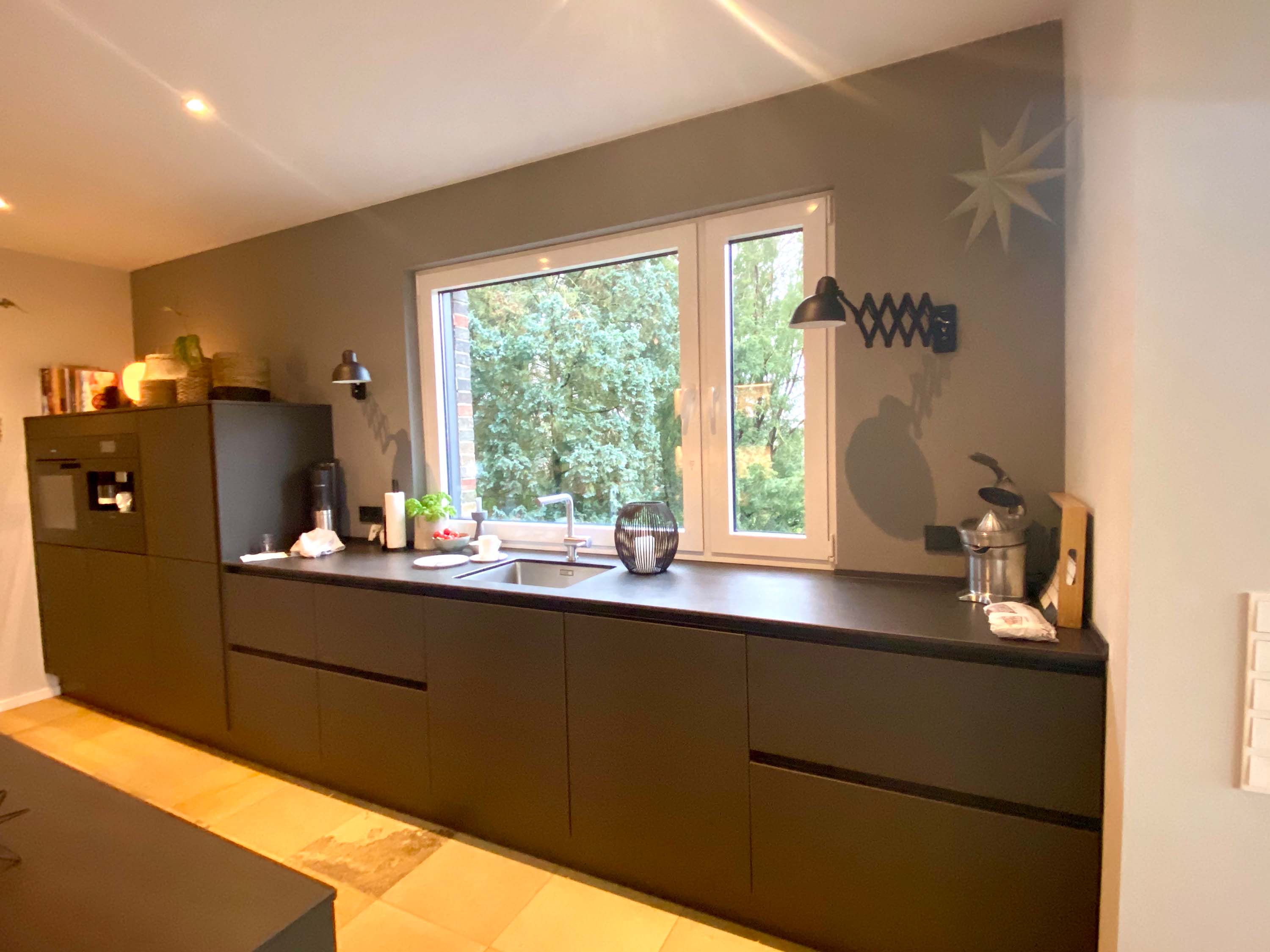 Für die Sanierung einer Wohnung mit sehr großen und somit anspruchsvollen Räumen wurde ein Gesamtkonzept entwickelt, um auf der einen Seite gestalterische Klarheit und gleichzeitig Wohnlichkeit und Behaglichkeit zu erzielen. Eine graue Wand, die sich durch drei Räume zieht und in einer anthrazit lackierten Bank endet, verbindet die Räume optisch miteinander. Das Lichtkonzept mit direkter und indirekter Beleuchtung unterstützt durch „Licht und Schatten” die Atmosphäre. Schließlich bringen Tapeten in ausgesuchten Teilen der Wohnung weitere „Spannung” in die Räumlichkeiten.