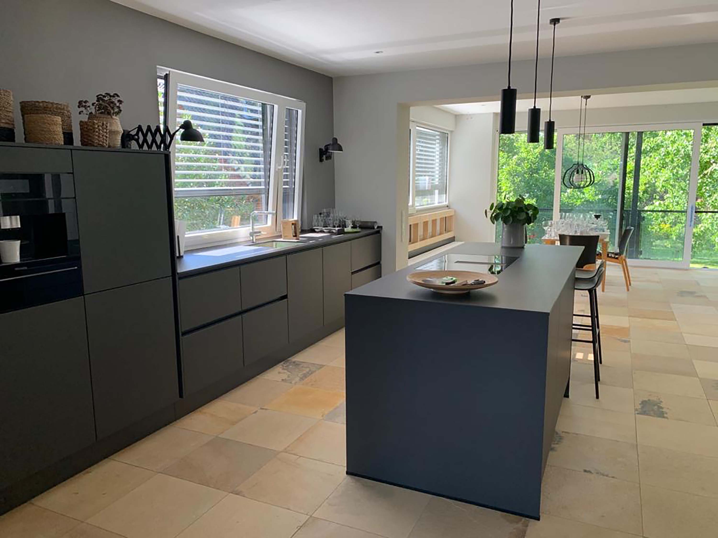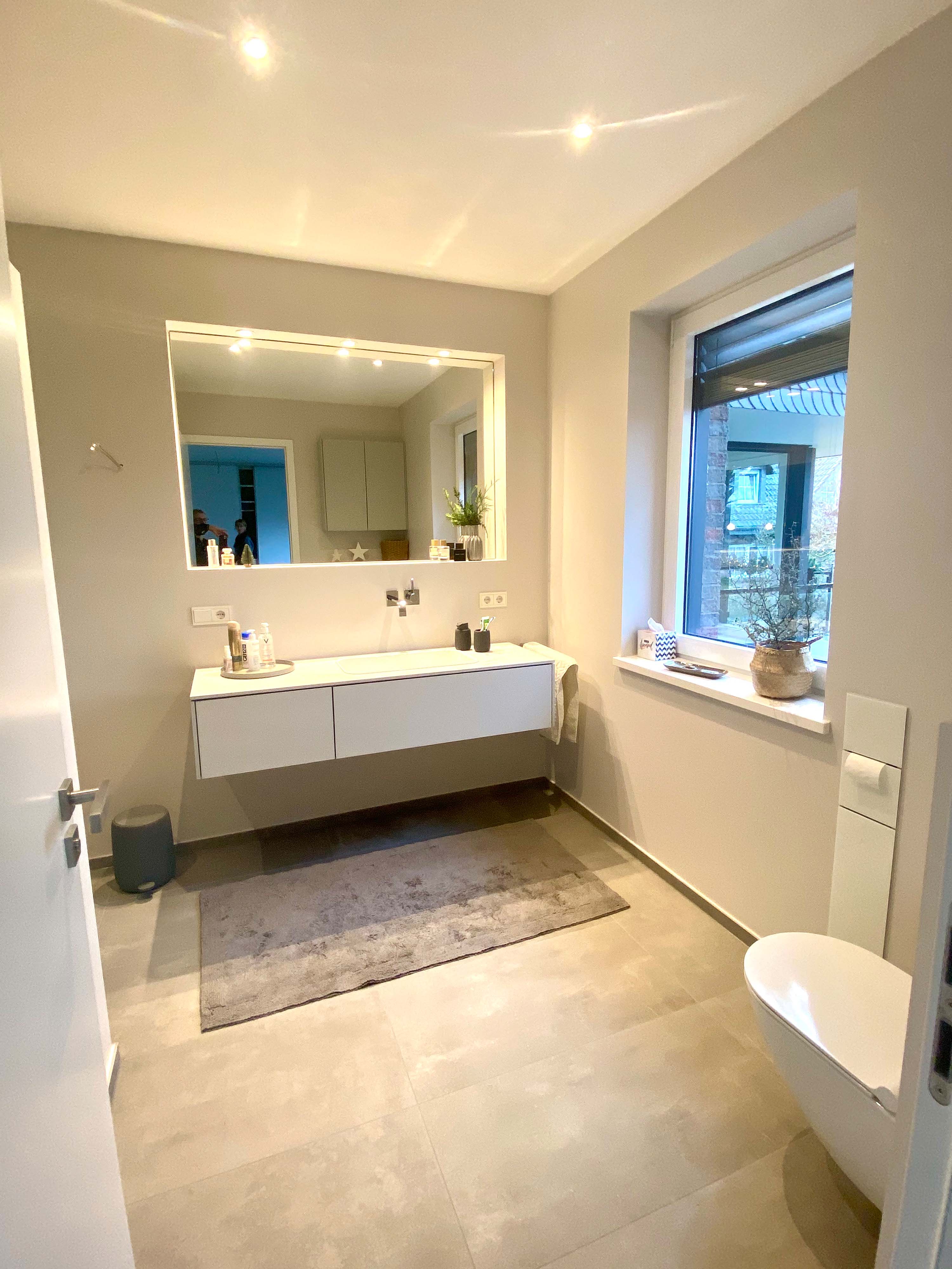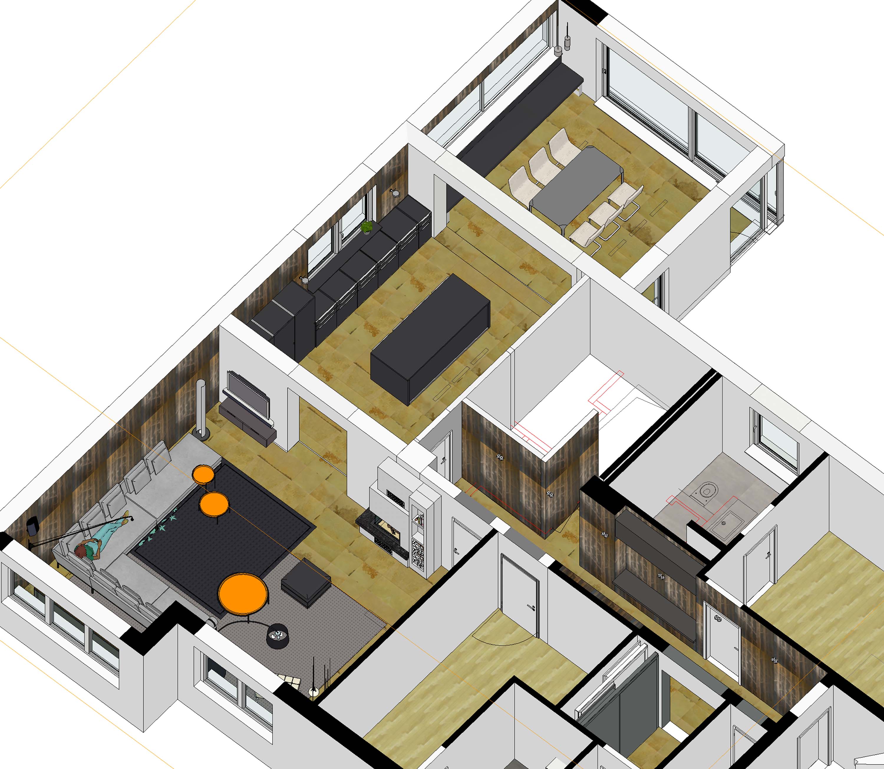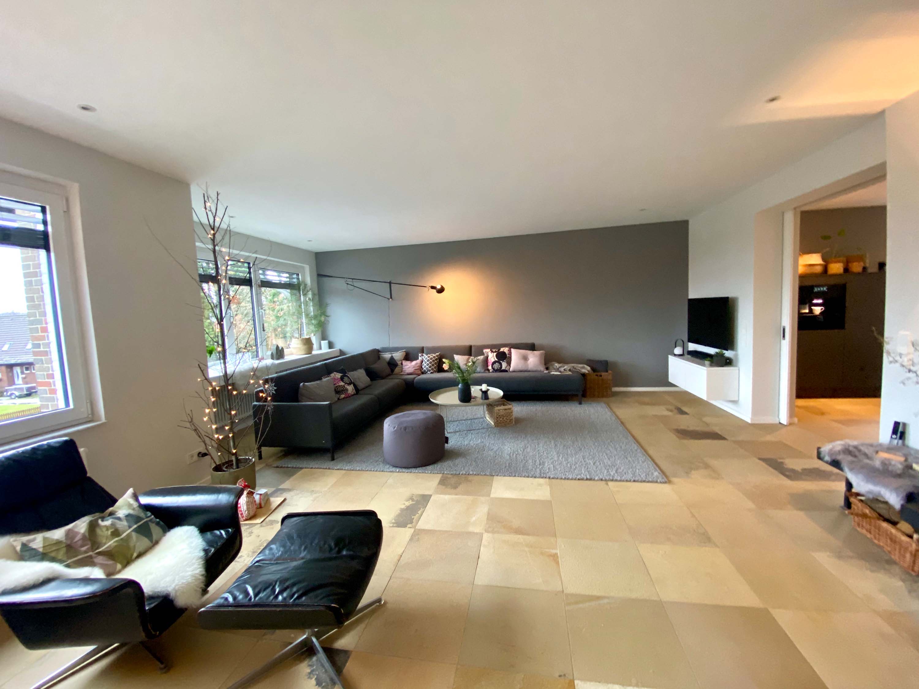Für die Sanierung einer Wohnung mit sehr großen und somit anspruchsvollen Räumen wurde ein Gesamtkonzept entwickelt, um auf der einen Seite gestalterische Klarheit und gleichzeitig Wohnlichkeit und Behaglichkeit zu erzielen. Eine graue Wand, die sich durch drei Räume zieht und in einer anthrazit lackierten Bank endet, verbindet die Räume optisch miteinander. Das Lichtkonzept mit direkter und indirekter Beleuchtung unterstützt durch „Licht und Schatten” die Atmosphäre. Schließlich bringen Tapeten in ausgesuchten Teilen der Wohnung weitere „Spannung” in die Räumlichkeiten.